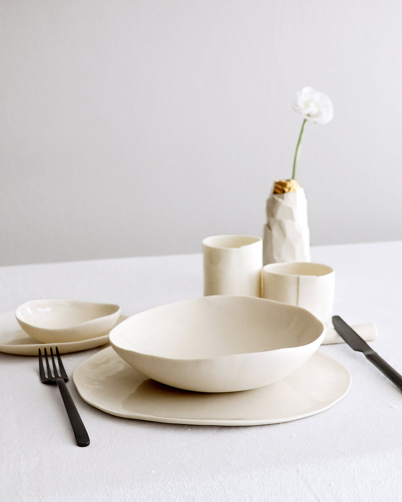 The clay used is a high-quality European porcelain. After firing at high temperature it’s a warm white color.